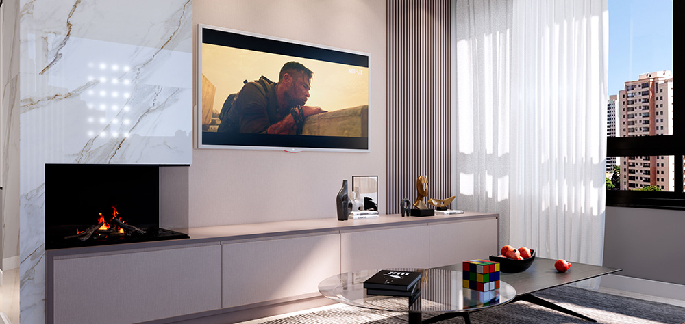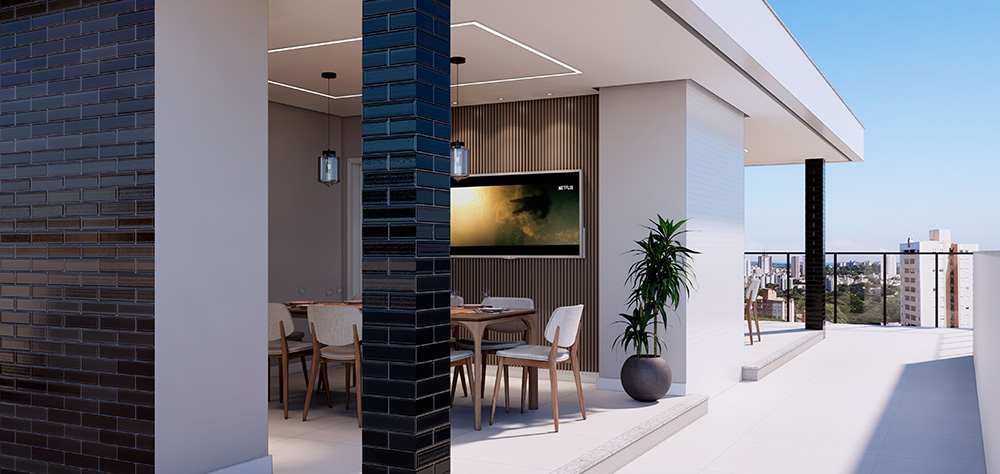 Portaria digital; Elevador com capacidade para oito pessoas e bateria auxiliar; Vaga com espera para carregamento de veículo elétrico; - Playground; Dois rooftop’s com uma churrasqueira cada e vista panorâmica; Jardim suspenso com fogo de chão.